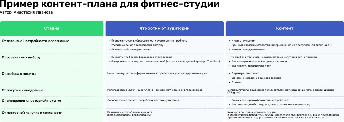 - Определите темы контента. Они должны соответствовать этапам клиентского пути и желаемой реакции аудитории. На начальном этапе нужна образовательная информация: мифы о похудении, как часто и по скольку нужно тренироваться, как выбрать вид спорта и пр. Здесь же будут актуальны примеры успешных клиентов и тренеров, иллюстрации до и после.