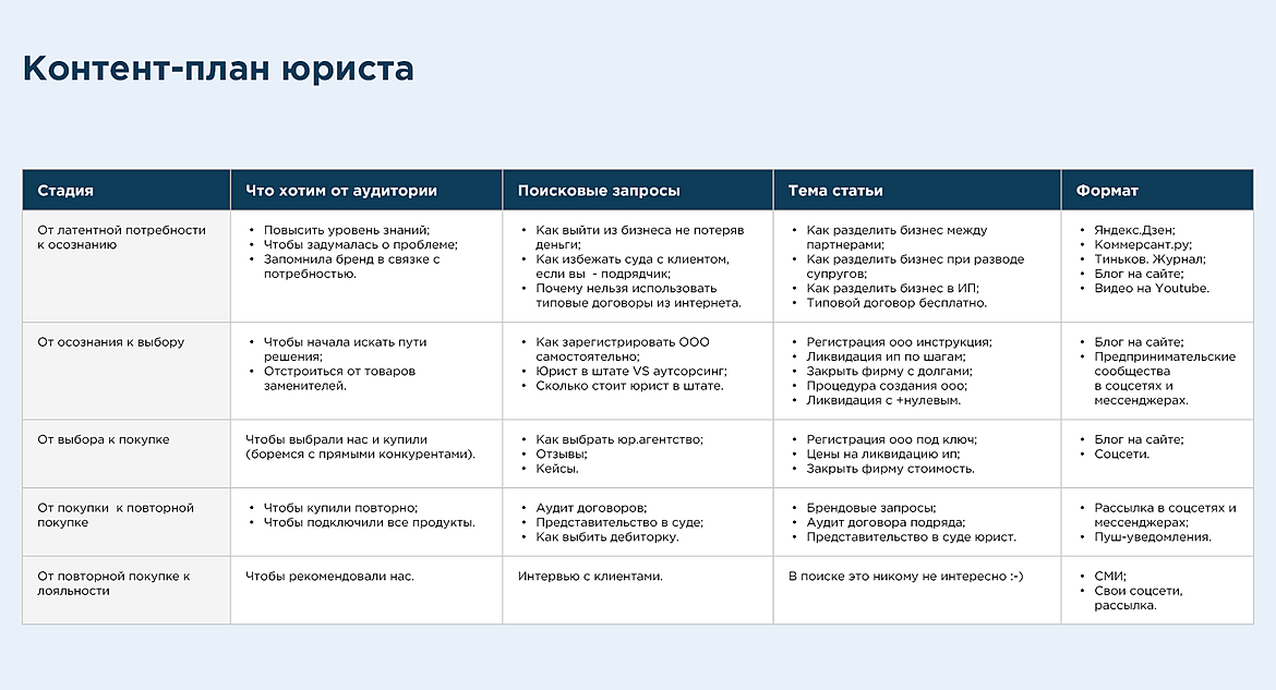 Внимательно выбирайте темы. Клиентам с несформированной потребностью можно давать юридические советы. Например, почему нельзя пользоваться типовыми договорами из интернета, как избежать суда с недовольным клиентом компании-подрядчику и т. д. А тем, кто выбирает конкретную юридическую фирму – показать кейсы, рассказать о нюансах работы юристов.