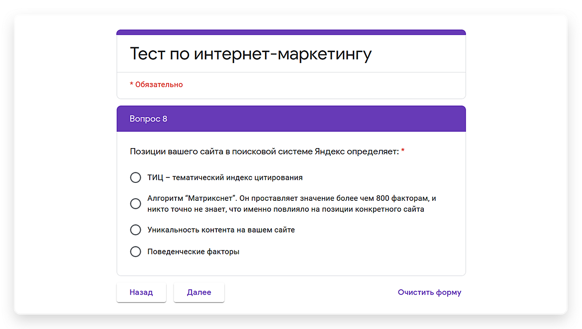 Я составила несложный тест в Google Forms. Он помог отсеять кандидатов, которые совсем не разбираются в интернет-маркетинге. Мы не искали гуру в диджитал, но контент-маркетолог должен понимать, о чем пишет. Не на уровне эксперта, но как квалифицированный заказчик. В тесте 12 заданий и два открытых вопроса, где кандидат должен был показать ход своих мыслей.